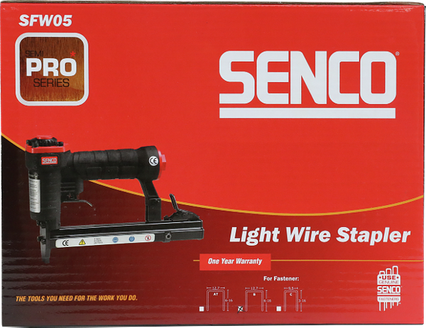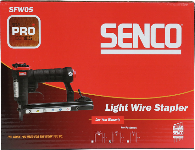 Omschrijving: De pneumatische SFW05 is een lichtgewicht nietmachine verkrijgbaar in verschillende modellen welke nieten met een lengte tussen 3 en 16 mm verwerken. Deze serie nietmachines zijn ontworpen voor lichte en semi-professionele toepassingen. De machine maakt deel uit van de SemiPro-serie, welke voorzien zijn van "trigger fire" voor maximale veiligheid en 1 jaar Senco garantie. De SFW05 is gemakkelijk te herkennen aan de rode kap en de kenmerkende zwarte behuizing en is een slanke, compacte machine voor lichte toepassingen.